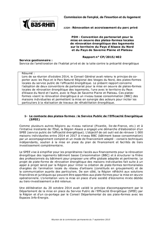 Lors de sa réunion d'octobre 2014, le Conseil Général avait retenu le principe de co-porter avec les Pays et le Parc Naturel Régional des Vosges du Nord, des plates-formes locales du service public de l'efficacité énergétique. Le présent rapport concerne l'adoption de deux conventions de partenariat pour la mise en oeuvre de plates-formes locales de rénovation énergétique des logements, l'une avec le territoire du Pays d'Alsace du Nord et l'autre, avec le Pays de Saverne Plaine et Plateau. Ces plates-formes visent la rénovation énergétique à un niveau basse consommation (BBC) des maisons individuelles et permettent la mise en synergie des acteurs pour inciter les particuliers à la réalisation de travaux de réhabilitation énergétique.