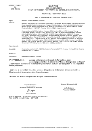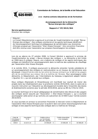 Le Conseil Départemental a approuvé le principe de l'expérimentation du projet ''Bonus Energie des collèges''. Des collèges volontaires et les agents techniques bénéficient de l'accompagnement technique et pédagogique de sensibilisation aux économies d'énergie proposé par l'Association ''Alter-Alsace Energies''. Une convention financière doit être conclue avec l'association qui propose d'accompagner les collèges.