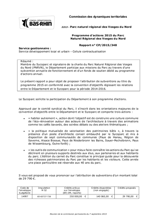 Membre du Sycoparc et signataire de la charte du Parc Naturel Régional des Vosges du Nord (PNRVN), le Département participe aux missions du Parc au travers d'une subvention annuelle de fonctionnement et d'un fonds de soutien dédié au programme d'actions annuel. Le présent rapport a pour objet de proposer l'attribution de subventions au titre du programme 2015 en conformité avec la convention d'objectifs régissant les relations entre le Département et le Sycoparc pour la période 2014-2016.