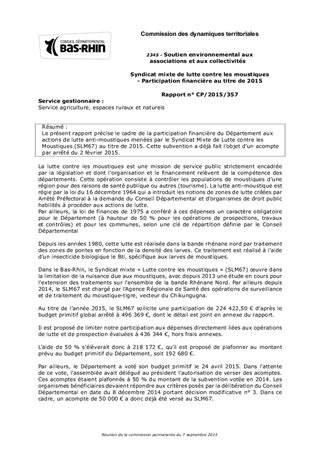 Le présent rapport précise le cadre de la participation financière du Département aux actions de lutte anti-moustiques menées par le Syndicat Mixte de Lutte contre les Moustiques (SLM67) au titre de 2015. Cette subvention a déjà fait l’objet d’un acompte par arrêté du 2 février 2015.