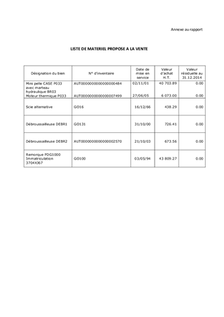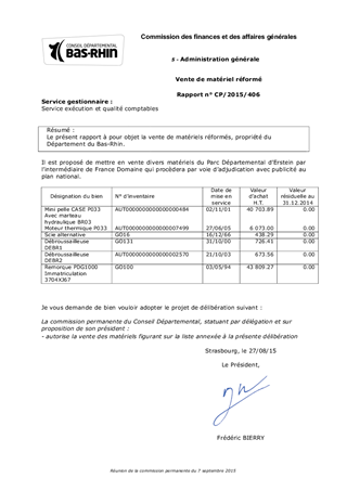 Vente de matériel réformé Resumé Le présent rapport à pour objet la vente de matériels réformés, propriété du Département du Bas-Rhin. Pièces jointes Délibération Rapport Liste de matériel proposé à la vente Assemblée : Commission Permanente Date : 07/09/2015 Rapporteur : Monsieur Bernard FISCHER Collectivité : Conseil départemental du Bas-Rhin Direction : Direction des finances et de la commande publique Service : Service exécution et qualité comptables Domaine : Non renseigné Commission : 1 - Commission des finances et des affaires générales