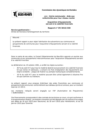Le présent rapport a pour objet l’attribution de subventions aux communes et groupements de communes pour l’acquisition d’équipements servant à la viabilité hivernale