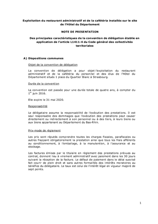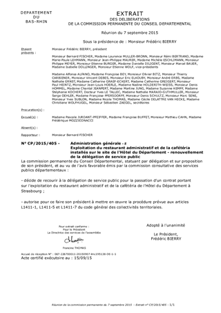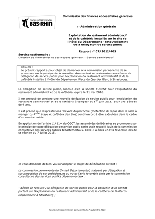 Le présent rapport a pour objet de demander à la commission permanente de se prononcer sur le principe de la passation d’un contrat de restauration sous forme de délégation de service public pour l’exploitation du restaurant administratif et de la cafétéria installés à l’Hôtel du Département Place du Quartier Blanc à Strasbourg.