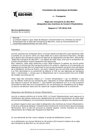 Le présent rapport a pour objet de désigner nominativement les membres du Conseil d'exploitation de la régie des transports du Bas-Rhin, suite au renouvellement de l'assemblée départementale de mars 2015.