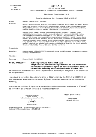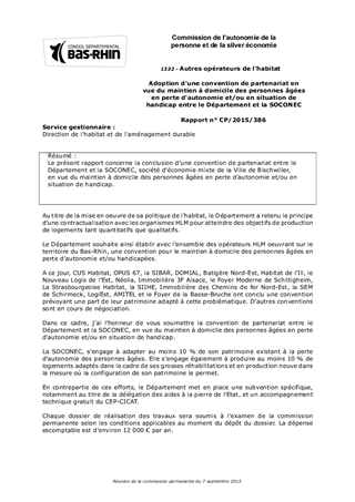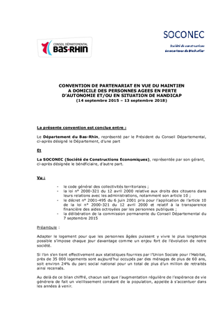 Le présent rapport concerne la conclusion d’une convention de partenariat entre le Département et la SOCONEC, société d'économie mixte de la Ville de Bischwiller, en vue du maintien à domicile des personnes âgées en perte d’autonomie et/ou en situation de handicap.
