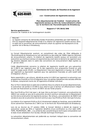 Le rapport concerne les demandes d'aides financières présentées par CUS Habitat au titre du dispositif départemental d'aide à la création de logements locatifs sociaux dans le cadre de la convention de renouvellement urbain du quartier de Hautepierre et du quartier de la Meinau à Strasbourg.