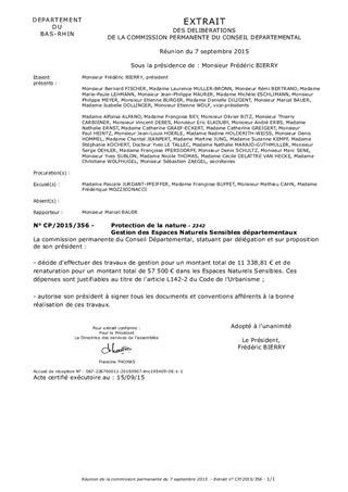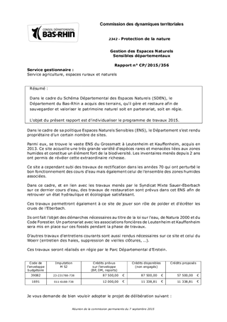 Dans le cadre du Schéma Départemental des Espaces Naturels (SDEN), le Département du Bas-Rhin a acquis des terrains, qu'il gère et restaure afin de sauvegarder et valoriser le patrimoine naturel soit en partenariat, soit en régie. L'objet du présent rapport est d'individualiser le programme de travaux 2015.