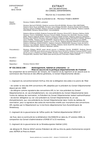 Dans le cadre des orientations retenues par la démarche 'Territoires 2030' et dans la logique de mise en oeuvre du plan départemental de l'habitat (PDH) adopté en octobre 2009, le Conseil Départemental, lors de sa réunion du 10 décembre 2012, a décidé de généraliser la territorialisation de sa politique départementale de l'habitat, qui permet d'apporter une aide d'ingénierie et des dispositifs de soutien différenciés et adaptés aux enjeux et priorités de chaque territoire. Il poursuit ainsi une politique de l'habitat volontariste, ambitieuse et globale, tout en jouant un rôle de chef de file de la politique de l'habitat à l'échelle des territoires. Le présent rapport vient apporter des précisions techniques aux dispositifs existants suivants sans impact budgétaire à court et long termes : 1. Précisions sur le conventionnement HLM au titre de la délégation des aides à la pierre de l'Etat, 2. Précision sur la gouvernance de l'office public de l'habitat départemental OPUS 67. 3. Précision sur la gouvernance de La Strasbourgeoise Habitat Ces évolutions concernent des ajustements techniques pour sécuriser les dispositifs ou répondent à des obligations règlementaires. Elles n'impactent pas les réflexions à mener sur la révision des politiques départementales puisque précisant des engagements antérieurs comme les quartiers plus 67 ou appiquant une obligation réglementaire (ex. réitération des convntion APL ou de la gouvernance de strauctures HLM proches du Département).