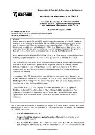 Aux termes de la loi du 31 mai 1990 modifiée dernièrement par la loi ALUR (accès au logement et un urbanisme rénové) du 24 mars 2014, le plan départemental d’action pour le logement et l’hébergement des personnes défavorisées (PDALHPD) est un domaine de compétences partagées entre l'Etat et le Département pour mener une stratégie d'ensemble de lutte contre le mal-logement et pour le respect des principes du droit au logement, en intégrant désormais le champ de l'hébergement. Après avoir évalué le PDALPD 2010-2014, l’Etat et le Département du Bas-Rhin doivent élaborer, adopter et copiloter le nouveau Plan qui couvrira la période 2015-2020. Lors de la réunion du 6 juillet 2015, le Conseil Départemental a approuvé les principes fondateurs et les orientations générales du projet de nouveau PDALHPD, servant de base à l’application de cette politique publique partenariale dans le Bas-Rhin, en particulier les axes de progrès et les objectifs quantitatifs et territorialisés pour répondre aux besoins. Le nouveau PDALHPD doit permettre essentiellement de poursuivre et d’adapter les actions existantes en matière de logement, de fixer le champ d’intervention en matière d’hébergement et de déployer des actions nouvelles, dans un cadre de gouvernance consolidé sur le plan politique et technique. Le PDALHPD 2015-2020 sera proposé d’ici la fin de l’année 2015 à la signature de l’Etat, du Conseil Départemental, de l’Eurométropole (déjà signataire du Plan précédent), de la Ville de Strasbourg, de la Caisse d’Allocations Familiales (déjà signataire du Plan précédent) et de l’association régionale des bailleurs sociaux (l'AREAL).
