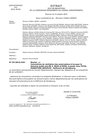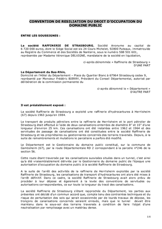 Le présent rapport a pour objet la résiliation du droit d'occupation du domaine public des RD2, RD29 et RD94 consenti à la Raffinerie de Strasbourg par le Département du Bas-Rhin. Il vise à proposer la validation des conventions de résiliation entre le Département et la société TOTAL.