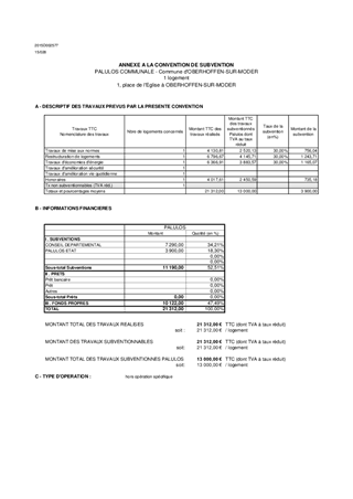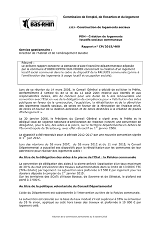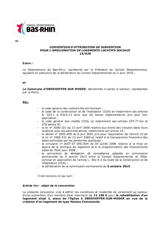 Le présent rapport concerne la demande d’aide financière départementale déposée par la commune d’OBERHOFFEN-SUR-MODER concernant la création d’un logement locatif social communal dans le cadre du dispositif de la PALULOS communale (prime à l'amélioration des logements à usage locatif et occupation sociale).