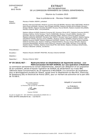 La convention de coopération pour le développement durable de l’Alsace, signée entre le Département du Bas-Rhin, Electricité de Strasbourg (ES) et Electricité de France (EDF) cible notamment des actions de rénovation du patrimoine du Conseil Départemental (collèges), des actions dans le domaine de la précarité énergétique, l’étude et le développement d’énergies renouvelables ou d’équipements innovants en lien avec l’énergie, la création de logements aidés dans les bâtiments anciens et enfin la réhabilitation de logements locatifs aidés. L’aide financière du groupe EDF et ÉS Énergies Strasbourg sur ces programmes est plafonnée à 1 060 000€. La réhabilitation BBC de 25 logements rue de Champagne et rue de Lorraine à Molsheim, par DOMIAL fait l’objet d’une aide de 75 000 € de la part d’ES, qui sera formalisée par la signature d’une convention entre ES et DOMIAL en présence d’un élu représentant le Département. Le présent rapport vise à inscrire cette opération dans le partenariat piloté par le Département.