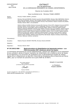 La convention de coopération pour le développement durable de l’Alsace, signée entre le Département du Bas-Rhin, Electricité de Strasbourg (ES) et Electricité de France (EDF) cible notamment des actions de rénovation du patrimoine du Conseil Départemental (collèges), des actions dans le domaine de la précarité énergétique, l’étude et le développement d’énergies renouvelables ou d’équipements innovants en lien avec l’énergie, la création de logements aidés dans les bâtiments anciens et enfin la réhabilitation de logements locatifs aidés. L’aide financière du groupe EDF et ÉS Énergies Strasbourg sur ces programmes est plafonnée à 1 060 000€. La réhabilitation des 10 logements de la future résidence sénior de Saales fait l’objet d’une aide de 30 000 € de la part d’EDF, qui sera formalisée par la signature d’une convention entre EDF et le maître d'ouvrage de la résidence sénior en présence d’un représentant du CD 67. Le présent rapport vise à inscrire cette opération dans le partenariat piloté par le Département.