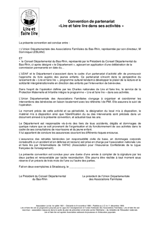 L’Union Départementale des Associations Familiales du Bas-Rhin et le Département s’associent dans le cadre d’un partenariat d’activité afin de promouvoir l’approche du livre auprès des jeunes enfants. Ce partenariat s’inscrit dans la perspective du lancement du programme culturel « Lire et faire lire », tendant à développer le plaisir de la lecture et la solidarité intergénérationnelle en direction des enfants par l’intervention de bénévoles. Le service de Protection Maternelle et Infantile intègre le programme « lire et faire lire » dans ses activités et accueillera à ce titre les interventions des bénévoles de l’UDAF dans le cadre de l’animation des salles d’attente de ses consultations du nourrisson et du jeune enfant.