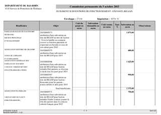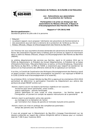 Le présent rapport vise à proposer l’attribution de subventions de fonctionnement à des associations œuvrant dans le domaine de la protection de l’enfance au titre du Réseau d’Ecoute, d’Appui et d’Accompagnement des Parents du Bas-Rhin.
