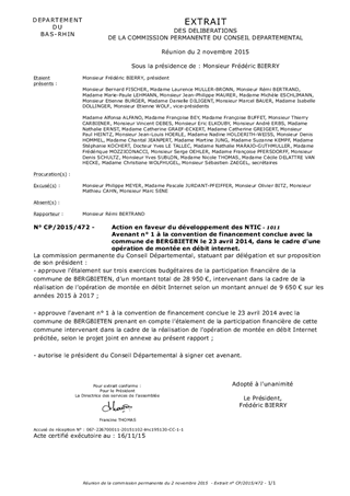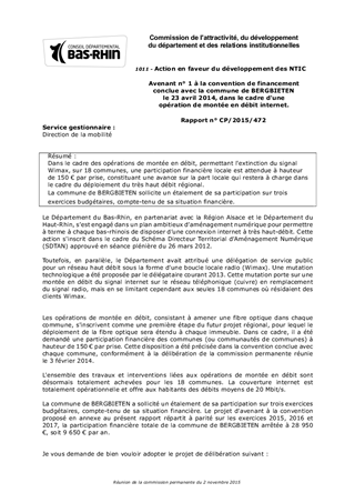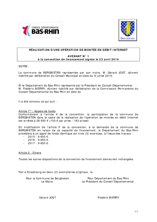 Avenant n° 1 à la convention de financement conclue avec la commune de BERGBIETEN le 23 avril 2014, dans le cadre d'une opération de montée en débit internet.