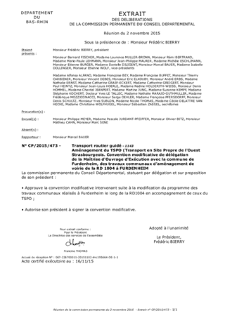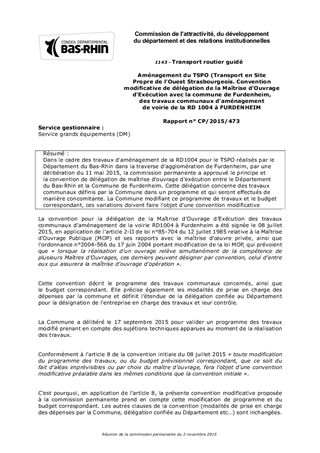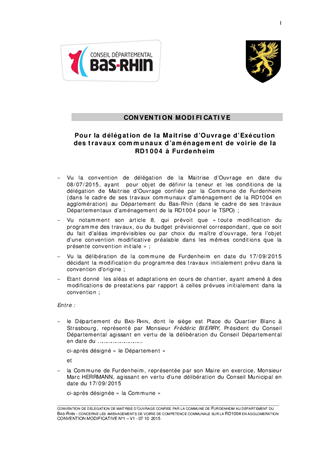 Dans le cadre des travaux d’aménagement de la RD1004 pour le TSPO réalisés par le Département du Bas-Rhin dans la traverse d’agglomération de Furdenheim, par une délibération du 11 mai 2015, la commission permanente a approuvé le principe et la convention de délégation de maîtrise d'ouvrage d'exécution entre le Département du Bas-Rhin et la Commune de Furdenheim. Cette délégation concerne des travaux communaux définis par la Commune dans un programme et qui seront effectués de manière concomitante. La Commune modifiant ce programme de travaux et le budget correspondant, ces variations doivent faire l’objet d’une convention modificative