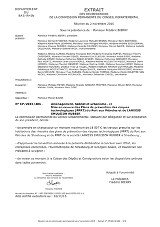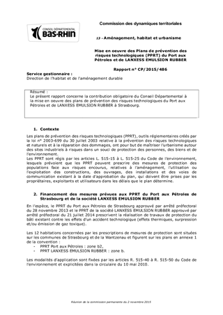 Le présent rapport concerne la contribution obligatoire du Conseil Départemental à la mise en oeuvre des plans de prévention des risques technologiques du Port aux Pétroles et de LANXESS EMULSION RUBBER à Strasbourg.