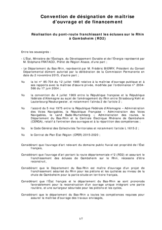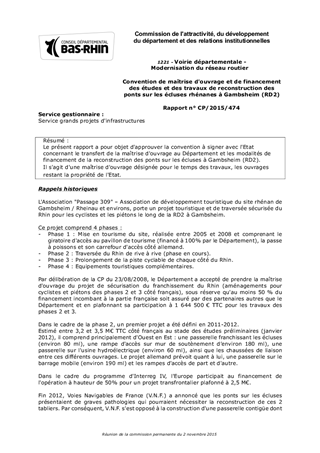Le présent rapport a pour objet d'approuver la convention à signer avec l'Etat concernant le transfert de la maîtrise d'ouvrage au Département et les modalités de financement de la reconstruction des ponts sur les écluses à Gambsheim (RD2). Il s'agit d'une maîtrise d'ouvrage désignée pour le temps des travaux, les ouvrages restant la propriété de l'Etat.