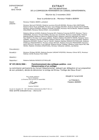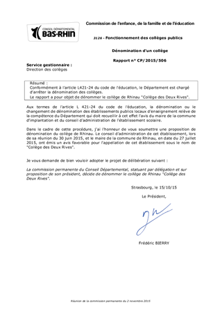 Conformément à l'article L421-24 du code de l'éducation, le Département est chargé d'arrêter la dénomination des collèges. Le rapport a pour objet de dénommer le collège de Rhinau "Collège des Deux Rives".