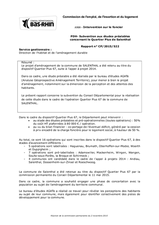 Le projet d'aménagement de la commune de SALENTHAL a été retenu au titre du dispositif Quartier Plus 67, suite à l’appel à projet 2014. Dans ce cadre, une étude préalable a été réalisée par le bureau d’études AGATe (Analyse Géoprospective Aménagement Territoire), pour mener à bien le projet d’aménagement, notamment sur la dimension de la perception et des attentes des habitants. Le présent rapport concerne la subvention du Conseil Départemental pour la réalisation de cette étude dans le cadre de l’opération Quartier Plus 67 de la commune de SALENTHAL.