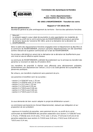 Le présent rapport a pour objet de soumettre à votre approbation les modalités de transfert au profit de la voirie communale de ROUNTZENHEIM de plusieurs parcelles de terrains issues de l'ancienne RD 1063, suite à la réalisation de la déviation de SOUFFLENHEIM.