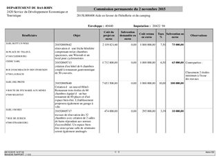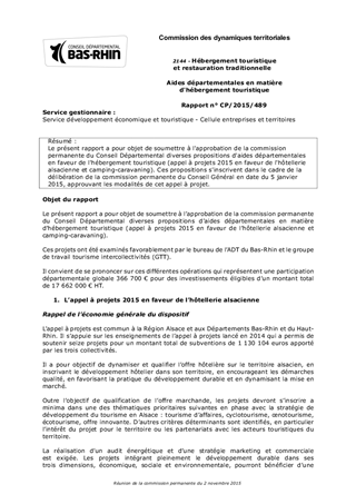 Le présent rapport a pour objet de soumettre à l'approbation de la commission permanente du Conseil Départemental diverses propositions d'aides départementales en faveur de l'hébergement touristique (appel à projets 2015 en faveur de l'hôtellerie alsacienne et camping-caravaning). Ces propositions s'inscrivent dans le cadre de la délibération de la commission permanente du Conseil Général en date du 5 janvier 2015, approuvant les modalités de cet appel à projet.