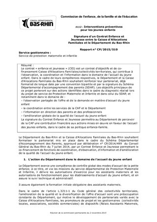 Le contrat « enfance et jeunesse » (CEJ) est un contrat d’objectifs et de co-financement Caisse d’Allocations Familiales/collectivités territoriales, qui contribue à l’observation, la coordination et l’information dans le domaine de l’accueil du jeune enfant. Dans le cadre de leurs compétences respectives, le Département et la Caisse d’Allocations Familiales du Bas-Rhin souhaitent renforcer leur partenariat, déjà formalisé de longue date par une convention bipartite et par la signature du Schéma Départemental d’accompagnement des parents (SDAP). Les objectifs principaux de ce projet porteront sur des actions identifiées dans le cadre du diagnostic réalisé lors du projet de service de Protection Maternelle et Infantile et dans celui du SDAP, et notamment dans le domaine de : - l’observation partagée de l’offre et de la demande en matière d’accueil du jeune enfant - la coordination entre les services de la CAF et le Département - l’information en direction des parents et des professionnels - l’amélioration globale de la qualité de l’accueil du jeune enfant La signature du Contrat Enfance et Jeunesse permettra au Département de percevoir de la CAF une contribution financière aux actions mises en œuvre en faveur de l’accueil des jeunes enfants, dans le cadre de sa politique enfance-famille.