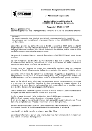 Le présent rapport a pour objet de soumettre à votre approbation les modalités financières du bien immobilier dit « la maison blanche » situé à SCHIRMECK, 6 Route de Barembach.