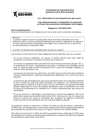 Le présent rapport concerne les demandes d'aide financière présentées par divers particuliers dans le cadre du dispositif départemental d'aide à l'adaptation du logement en faveur des personnes handicapées et/ou âgées mis en place lors de la réunion du Conseil Général du 12 décembre 1995. A ce titre, 44 dossiers sont présentés dans l'annexe au rapport.