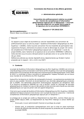 Ce rapport a pour objet de soumettre au vote de l’assemblée une convention de préfinancement pour la suite du projet « Système d’Information Géographique du Rhin Supérieur » (SIGRS). Cette nouvelle convention fixe les modalités de participation des signataires (français, allemands et suisses) et acte le démarrage du projet «Un centre de compétences d’information géographique appuyé par un Géoportail » (suite du projet SIGRS), dans l’attente de la signature de la convention INTERREG V afférente. Cette dernière couvrira alors rétroactivement la période entre le 1er juillet 2015 et le 30 juin 2018. Références précises aux textes législatifs et/ou réglementaires qui fondent l’action proposée par le rapport : Art L.1115-1 du CGCT.