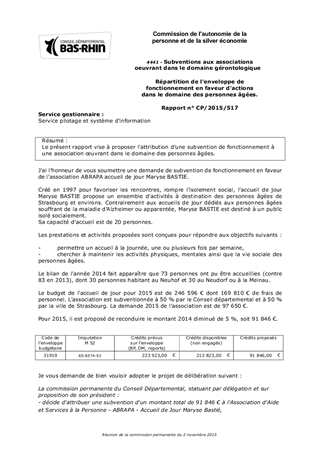 Le présent rapport vise à proposer l’attribution d’une subvention de fonctionnement à une association œuvrant dans le domaine des personnes âgées.
