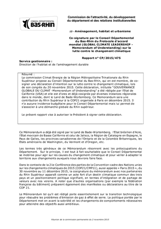 La commission Climat Energie de la Région Métropolitaine Trinationale du Rhin Supérieur propose au Conseil Départemental du Bas-Rhin, qui en est membre, de co-signer une déclaration d'intention sur la lutte contre le changement climatique, lors de son congrès du 20 novembre 2015. Cette déclaration, intitulée "GOUVERNANCE GLOBALE DU CLIMAT -Memorandum of Understanding" a été rédigée par l'Etat de Californie (USA) et elle est d'ores et déjà cosignée par diverses instances régionales dans le monde, dont le Land de Bade-Würtemberg. Ce Memorandum sera une contribution du Rhin Supérieur à la COP21 organisée à Paris en décembre 2015. Il n'a aucune incidence budgétaire pour le Conseil Départemental mais lui permet de s'associer à une démarche globale du Rhin supérieur. Le présent rapport vise à autoriser le Président à signer cette déclaration.