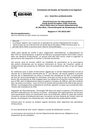 Le présent rapport vise à autoriser le président du Conseil Départemental à signer l'accord local sur les interventions du Fonds Social Européen (FSE) Inclusion pour la période 2014-2020, à conclure avec l'Etat et l'Eurométropole.