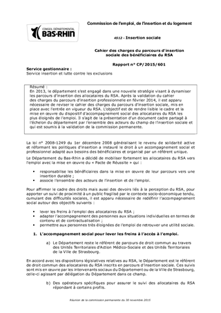 En 2013, le département s’est engagé dans une nouvelle stratégie visant à dynamiser les parcours d’insertion des allocataires du RSA. Après la validation du cahier des charges du parcours d’insertion professionnelle en février 2014, il est apparu nécessaire de reviser le cahier des charges du parcours d’insertion sociale, mis en place avec l'entrée en vigueur du RSA. L’objectif est de rendre lisible le cadre et la mise en œuvre du dispositif d’accompagnement social des allocataires du RSA les plus éloignés de l’emploi. Il s’agit de la présentation d’un document cadre partagé à l’échelon du département par l’ensemble des acteurs du champ de l’insertion sociale et qui est soumis à la validation de la commission permanente.