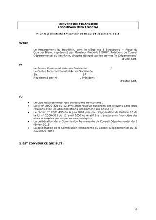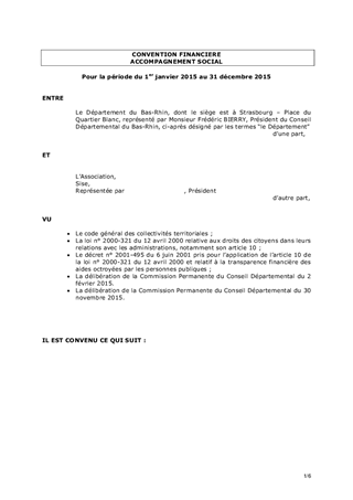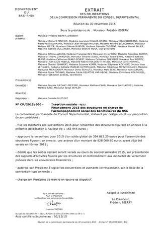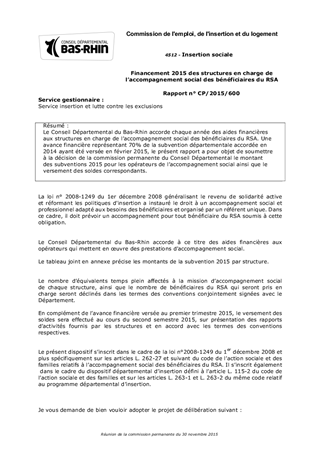 Le Conseil Départemental du Bas-Rhin accorde chaque année des aides financières aux structures en charge de l’accompagnement social des bénéficiaires du RSA. Une avance financière représentant 70% de la subvention départementale accordée en 2014 ayant été versée en février 2015, le présent rapport a pour objet de soumettre à la décision de la commission permanente du Conseil Départemental le montant des subventions 2015 pour les opérateurs de l’accompagnement social ainsi que le versement des soldes correspondants.