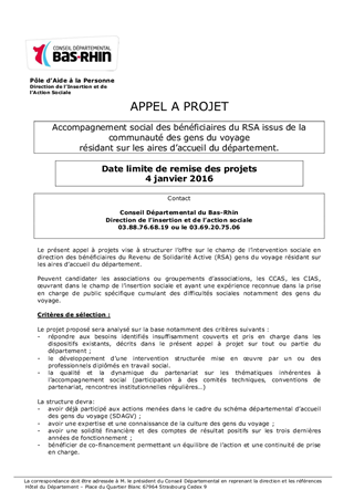 Depuis 2007 et jusqu’à sa fermeture en mars 2015, l’Association pour une Recherche Pédagogique Ouverte en Milieu Tzigane (ARPOMT) assurait une mission d’accompagnement des gens du voyage bénéficiaires du RSA. Afin de mieux structurer l’offre sur le champ de l'intervention en direction du public spécifique que constituent les gens du voyage, il est apparu nécessaire de lancer un appel à projet qui s’inscrit dans le cadre du schéma départemental d’accueil et dans celui du Pacte de Réussite engagé dans le champ de l’insertion des bénéficiaires du RSA.
