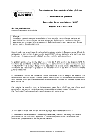 Le présent rapport propose la conclusion d'une nouvelle convention de partenariat avec l'UGAP. La convention de partenariat permet d'obtenir des conditions d'achats avantageuses en regard d'un engagement du Département quant au montant de ses achats auprès de cet organisme.