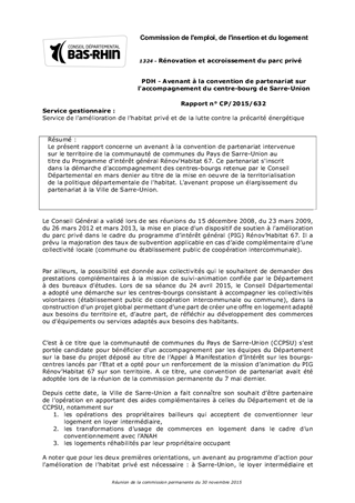 Le présent rapport concerne un avenant à la convention de partenariat intervenue sur le territoire de la communauté de communes du Pays de Sarre-Union au titre du Programme d'intérêt général Rénov'Habitat 67. Ce partenariat s'inscrit dans la démarche d'accompagnement des centres-bourgs retenue par le Conseil Départemental en mars denier au titre de la mise en oeuvre de la territorialisation de la politique départementale de l'habitat. L'avenant propose un élargissement du partenariat à la Ville de Sarre-Union.