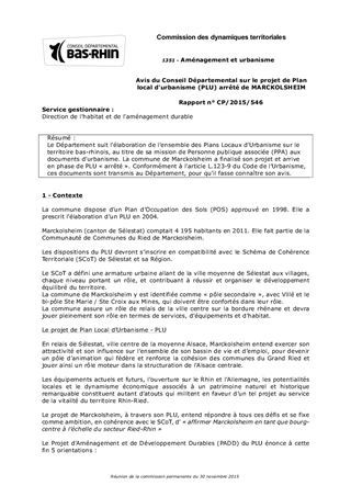 Le Département suit l’élaboration de l’ensemble des Plans Locaux d’Urbanisme sur le territoire bas-rhinois, au titre de sa mission de Personne publique associée (PPA) aux documents d’urbanisme. La commune de Marckolsheim a finalisé son projet et arrive en phase de PLU « arrêté ». Conformément à l'article L.123-9 du Code de l’Urbanisme, ces documents sont transmis au Département, pour qu’il fasse connaître son avis.