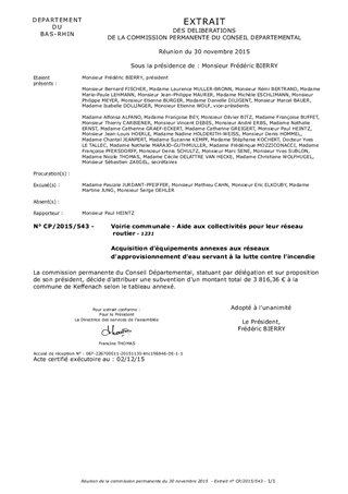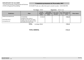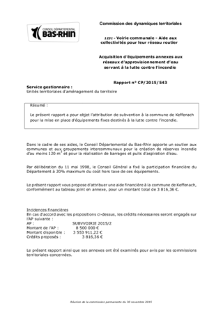 Le présent rapport a pour objet l’attribution de subvention à la commune de Keffenach pour la mise en place d’équipements fixes destinés à la lutte contre l’incendie.
