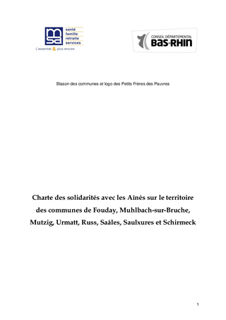 Le présent rapport a pour objet de soumettre à la décision de la commission permanente du Conseil Départemental la signature d’une charte de solidarité avec les aînés, démarche de développement social local co-pilotée par la Mutualité Sociale Agricole d’Alsace et le Département et s’inscrivant dans les préconisations du Pacte Social Local de la Vallée de la Bruche.