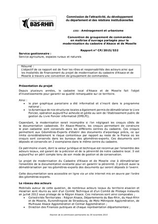 L’objectif de ce rapport est de fixer les rôles et responsabilités des acteurs ainsi que les modalités de financement du projet de modernisation du cadastre d’Alsace et de Moselle à travers une convention de groupement de commandes.