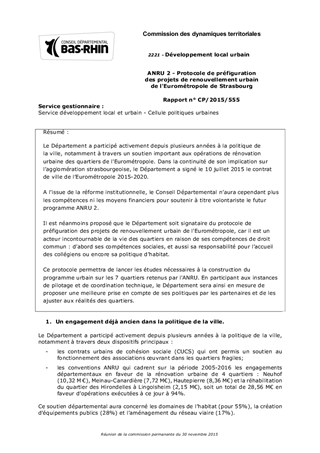 Le Département a participé activement depuis plusieurs années à la politique de la ville, notamment à travers un soutien important aux opérations de rénovation urbaine des quartiers de l'Eurométropole. Dans la continuité de son implication sur l’agglomération strasbourgeoise, le Département a signé le 10 juillet 2015 le contrat de ville de l’Eurométropole 2015-2020. A l’issue de la réforme institutionnelle, le Conseil Départemental n’aura cependant plus les compétences ni les moyens financiers pour soutenir à titre volontariste le futur programme ANRU 2. Il est néanmoins proposé que le Département soit signataire du protocole de préfiguration des projets de renouvellement urbain de l'Eurométropole, car il est un acteur incontournable de la vie des quartiers en raison de ses compétences de droit commun : d’abord ses compétences sociales, et aussi sa responsabilité pour l’accueil des collégiens ou encore sa politique d’habitat. Ce protocole permettra de lancer les études nécessaires à la construction du programme urbain sur les 7 quartiers retenus par l'ANRU. En participant aux instances de pilotage et de coordination technique, le Département sera ainsi en mesure de proposer une meilleure prise en compte de ses politiques par les partenaires et de les ajuster aux réalités des quartiers.