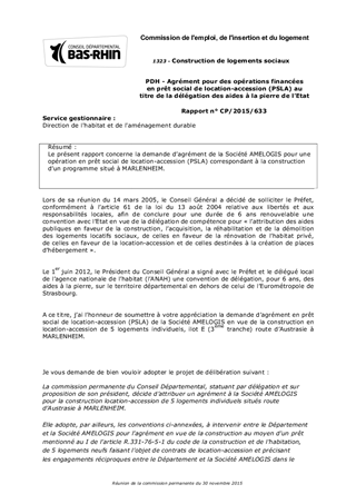 Le présent rapport concerne la demande d’agrément de la Société AMELOGIS pour une opération en prêt social de location-accession (PSLA) correspondant à la construction d’un programme situé à MARLENHEIM.