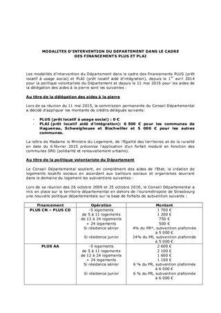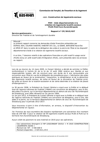 Le présent rapport concerne les demandes d’aide financière présentées par DOMIAL ESH, COLMAR HABITAT, HABITAT DE L’ILL, la SIBAR, BATIGERE Nord-Est et OPUS 67 dans le cadre de la délégation des aides à la pierre de l’Etat et du dispositif départemental d’aide à la création de logements locatifs sociaux. A ce titre, 7 dossiers relatifs à des opérations financées en prêt locatif à usage social (PLUS) et/ou en prêt locatif aidé d’intégration (PLAI), sont présentés dans les annexes au rapport.