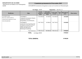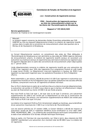 Le présent rapport concerne les demandes d'aides financières présentées par CUS HABITAT au titre du dispositif départemental d'aide à la création de logements locatifs sociaux dans le cadre de la convention de renouvellement urbain des quartiers de la Meinau et de Hautepierre à Strasbourg.