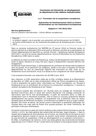 Le présent rapport vise à accorder une subvention de fonctionnement de 20.000 € au Centre d’Information sur les Institutions Européennes de Strasbourg pour l’année 2015.