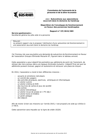 Le présent rapport vise à proposer l’attribution d’une subvention de fonctionnement à une association œuvrant dans le domaine du handicap