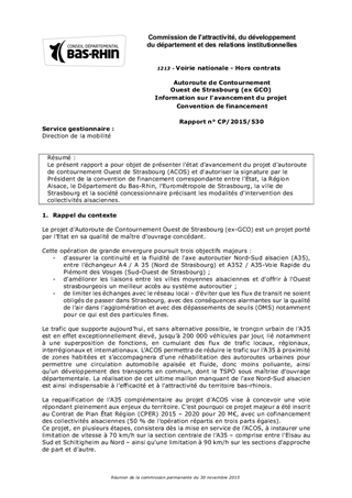 Le présent rapport a pour objet de présenter l'état d'avancement du projet d'autoroute de contournement Ouest de Strasbourg (ACOS) et d'autoriser la signature par le Président de la convention de financement correspondante entre l'Etat, la Région Alsace, le Département du Bas-Rhin, l’Eurométropole de Strasbourg, la ville de Strasbourg et la société concessionnaire précisant les modalités d'intervention des collectivités alsaciennes.